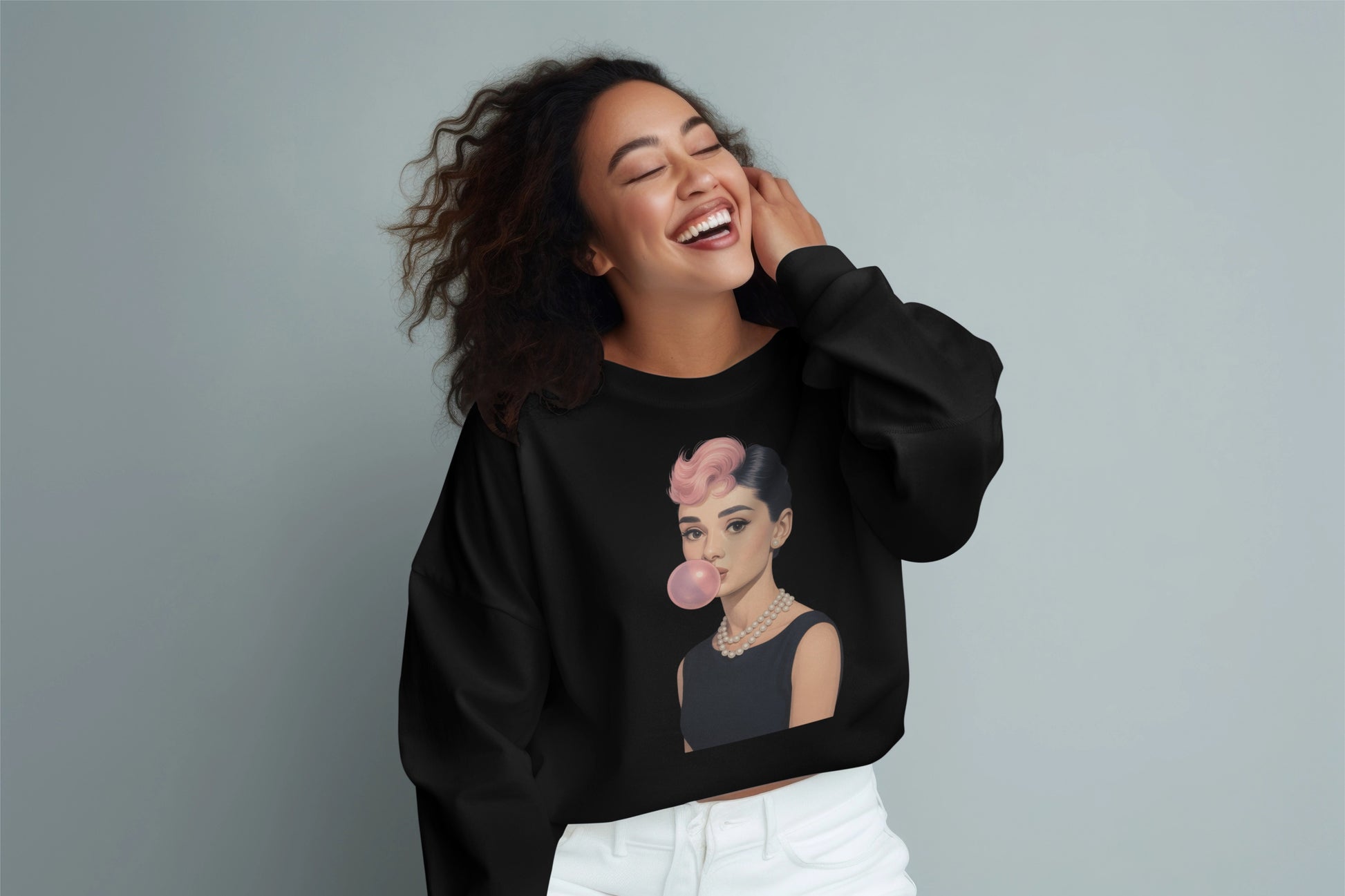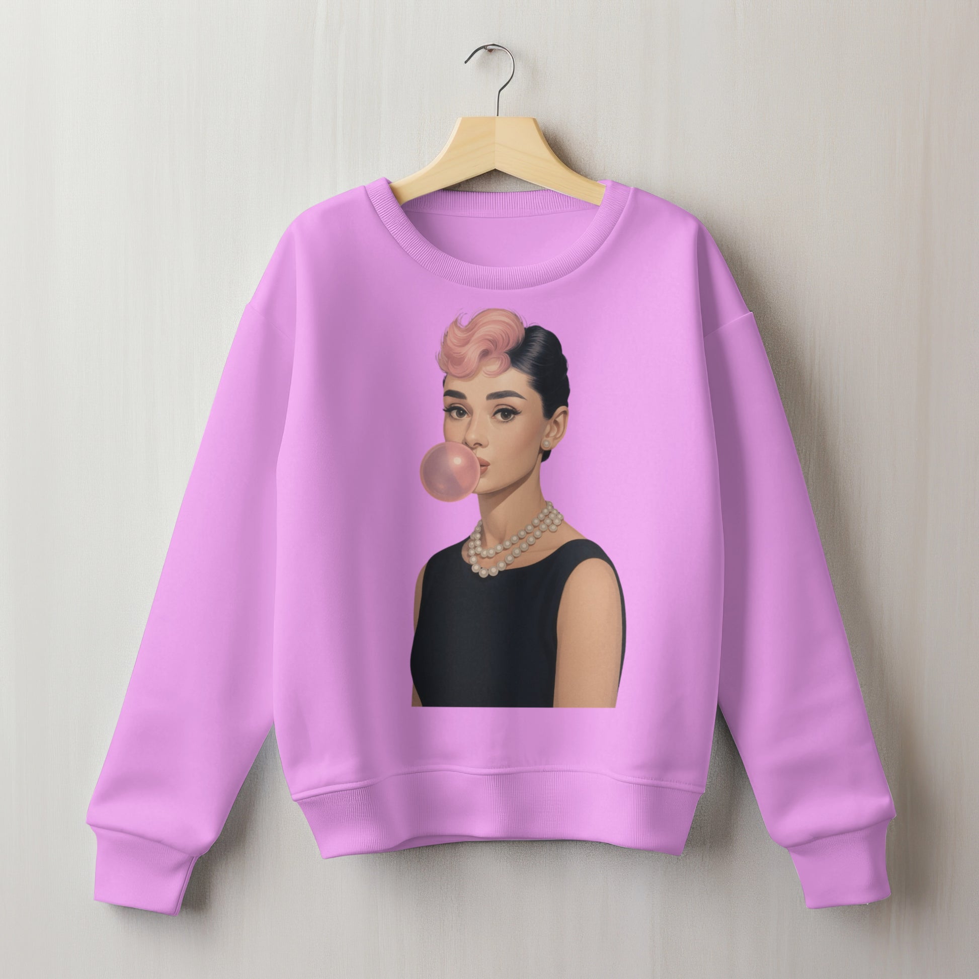 Kimbarli Audrey Hepburn Bubblegum Elegance Sweatshirt – Retro Glam Girl. This sweatshirt exudes a sense of retro glam and elegance, perfect for fashion-forward individuals looking to make a statement. Ideal for those who appreciate vintage vibes and want to stand out in style. Relevant for occasions like themed parties, vintage fashion events, and casual outings with a touch of flair.