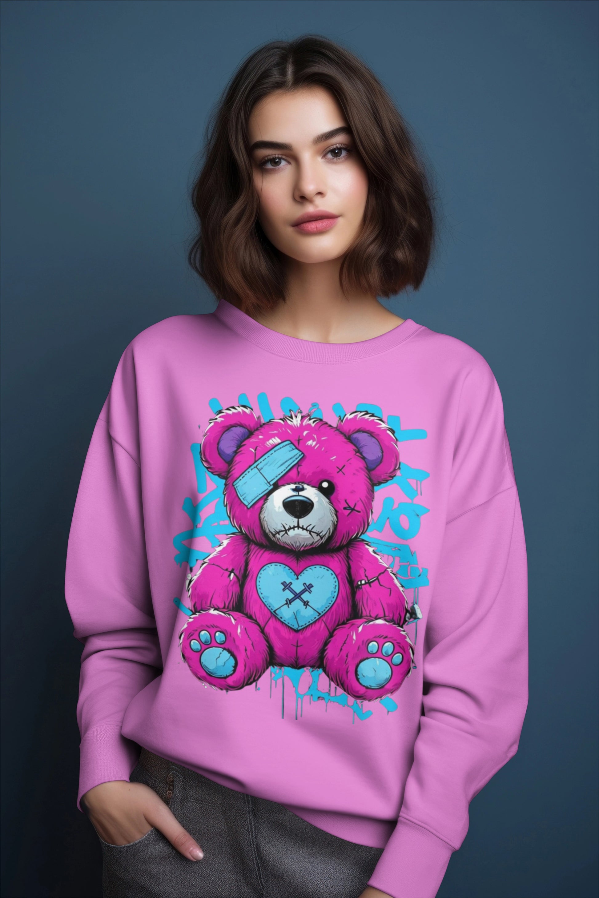 Embrace the edgy streetwear vibe with this Kimbarli™ Graffiti Broken Heart Teddy Bear Sweatshirt. Made with a cozy medium-heavy fabric blend, this sweatshirt is perfect for colder months and offers a comfy fit with a crew neckline. Ideal for adults looking to add a touch of urban style to their wardrobe.