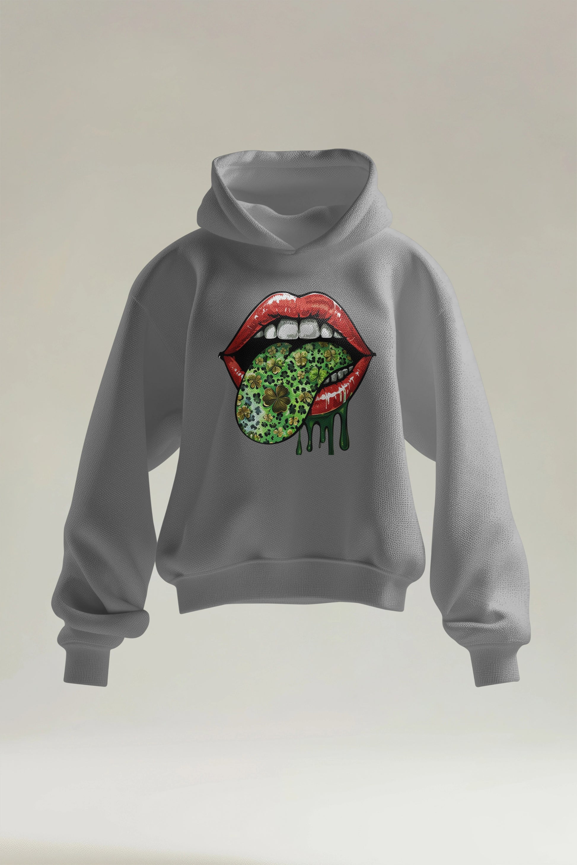 The Kimbarli Lucky Lips Hoodie takes Irish luck and turns it into a bold fashion statement. With glossy red lips, a dripping green shamrock tongue, and clovers scattered throughout, this hoodie brings the perfect mix of glam, attitude, and festive flair.