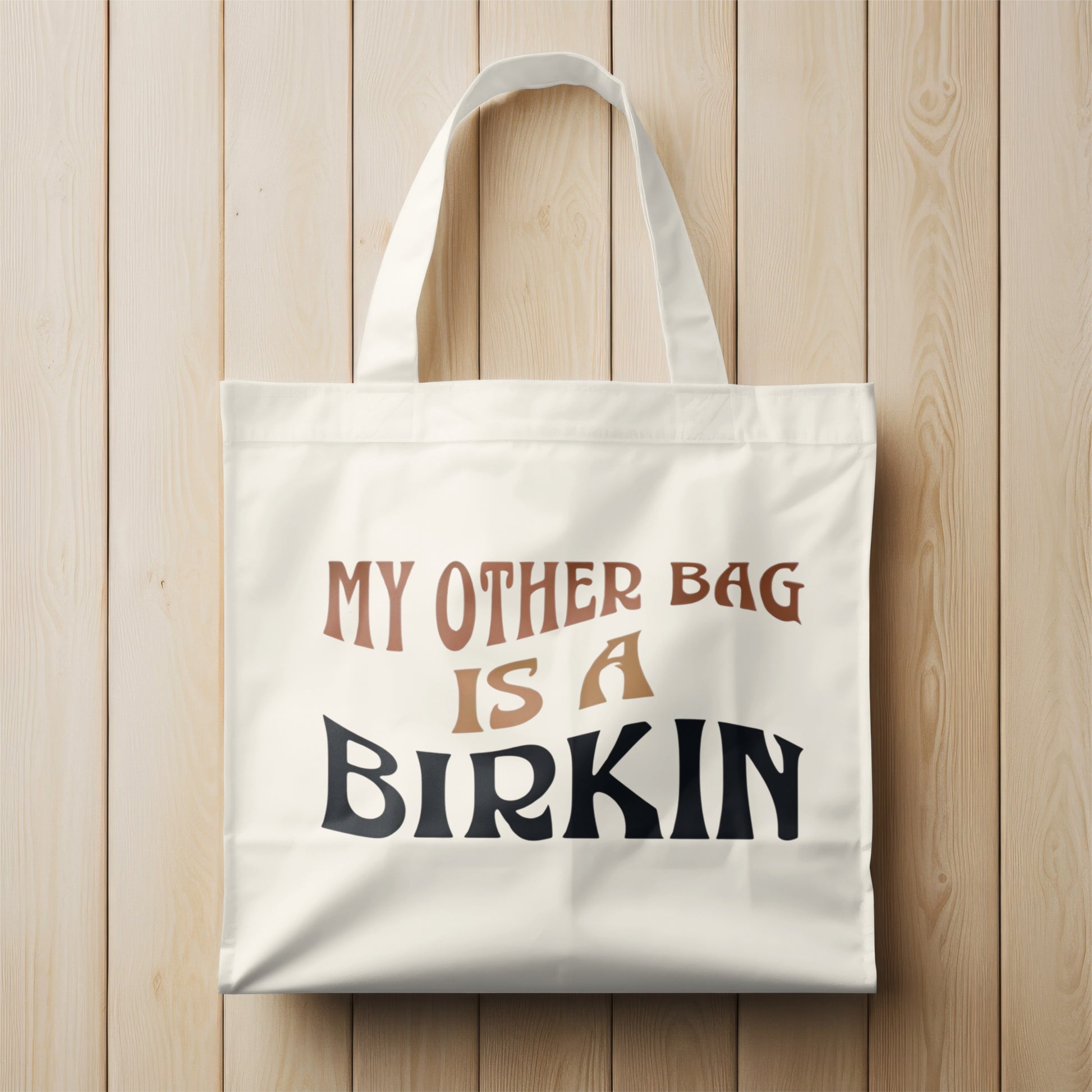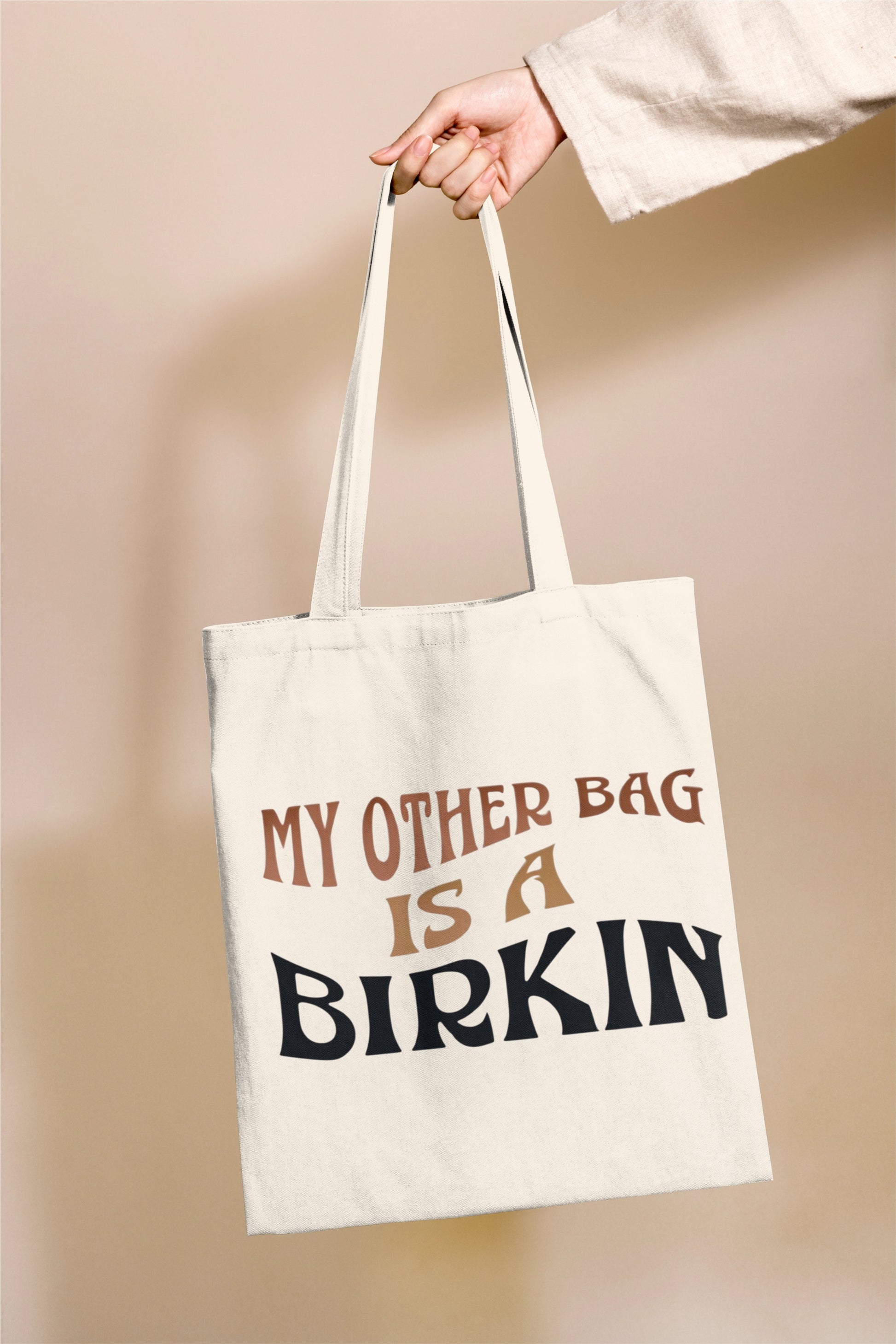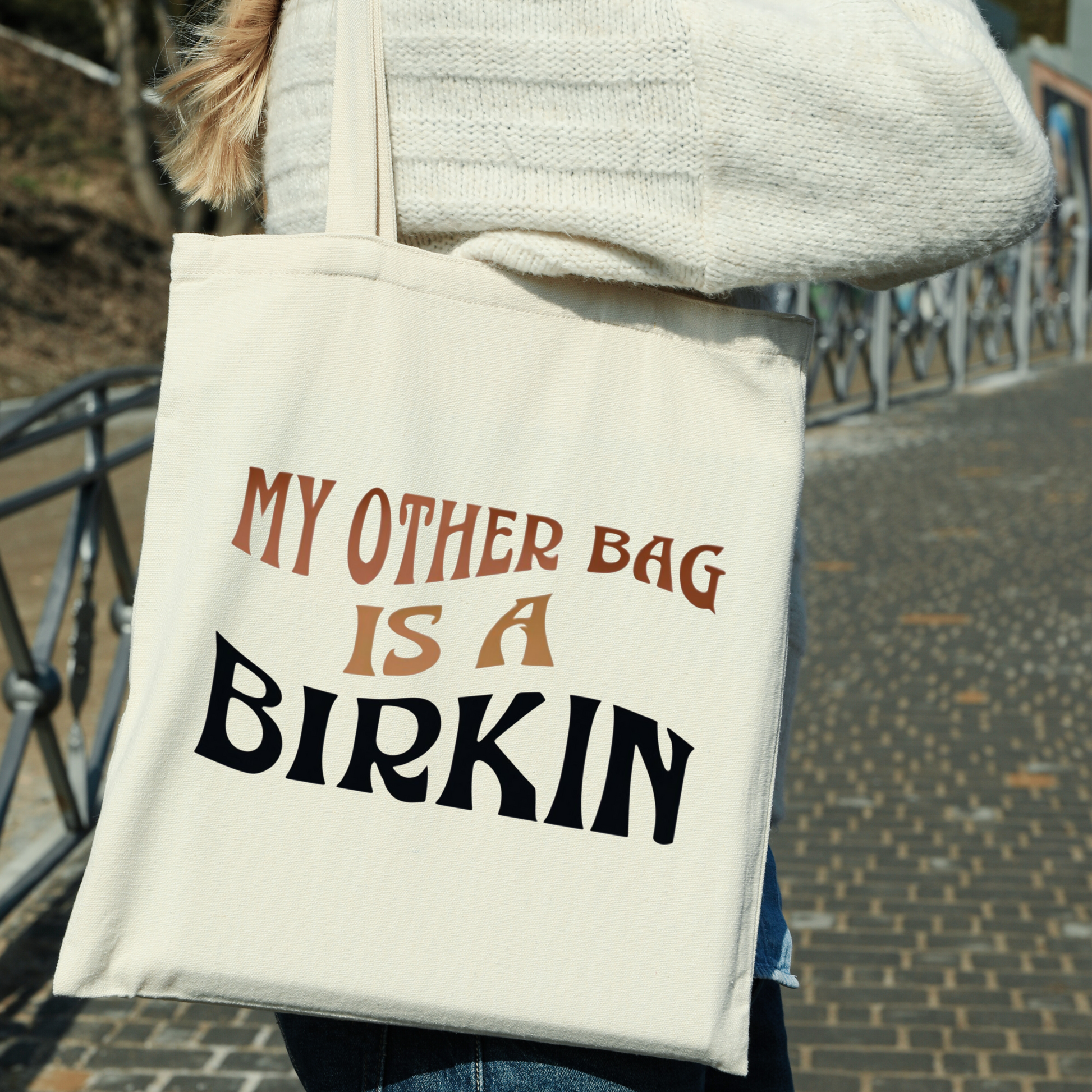 Own your fashion status with a wink and a smile. The Kimbarli “My Other Bag is a Birkin” Tote brings humor, high-end attitude, and practicality together in one iconic statement piece. Whether you're off to brunch, the bookstore, or the beach, this eco-friendly cotton tote adds a bold fashion-forward touch to any outfit.