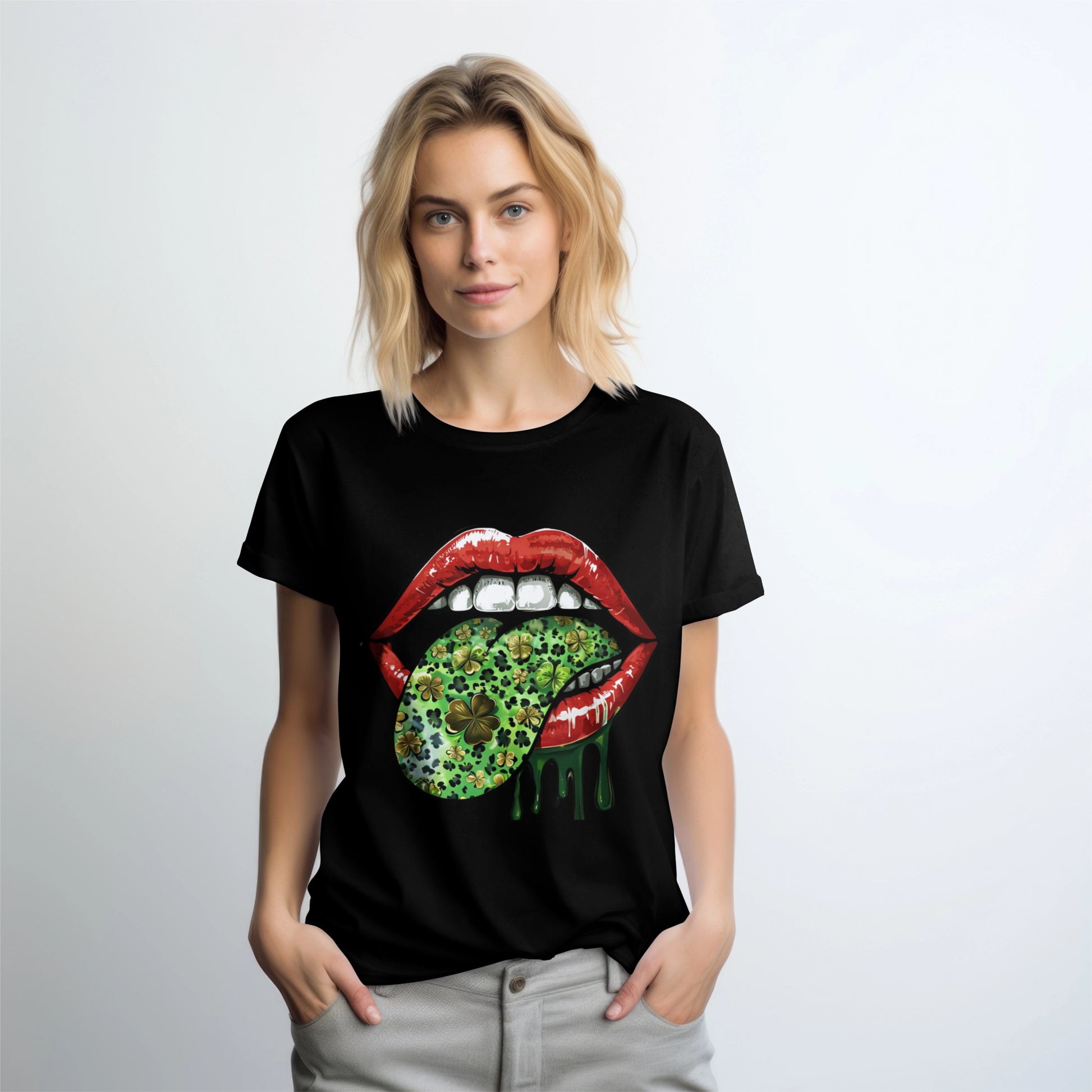 Make a statement this St. Patrick’s Day (or any day) in the Kimbarli Shamrock Lips Tee. Featuring glossy red lips and a dripping green tongue covered in shamrocks and clovers, this bold graphic design fuses edgy fashion with playful seasonal flair.