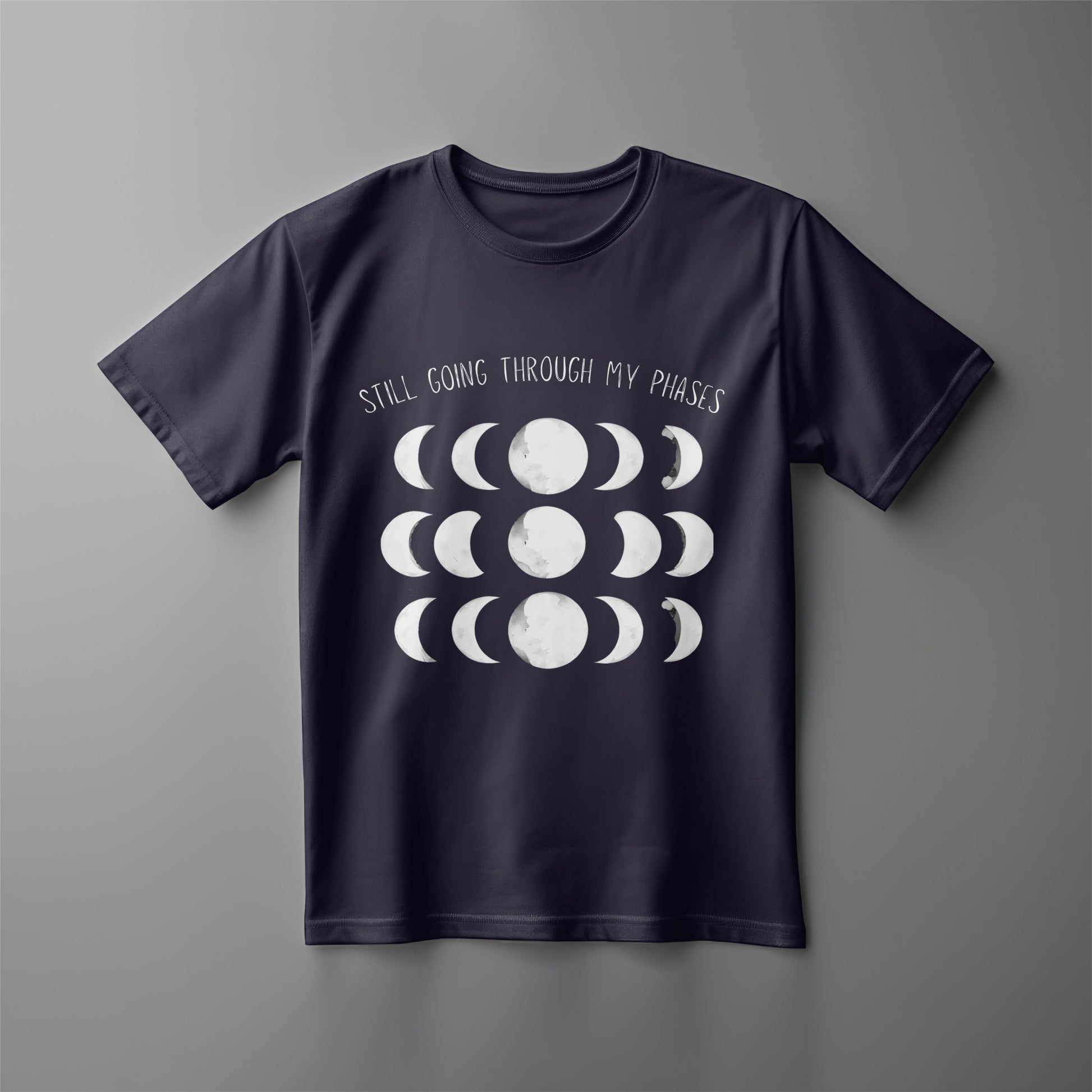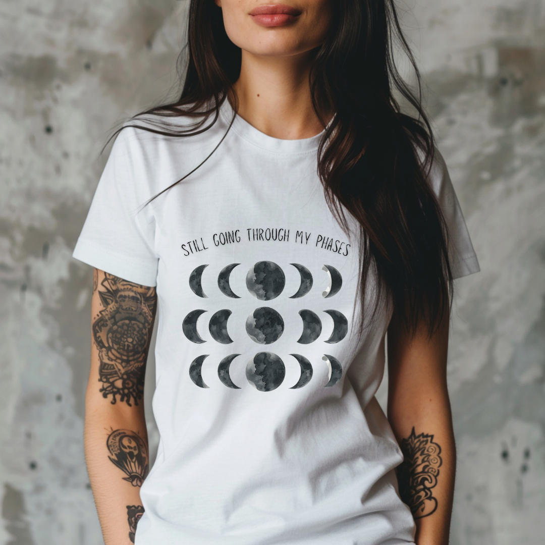 Celestial moon phases graphic with “Still Going Through My Phases” quote