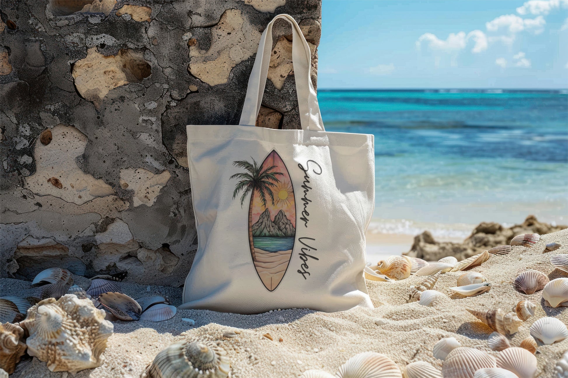 Bring sunshine everywhere you go with the Kimbarli “Summer Vibes” Canvas Tote – the perfect carryall for beach days, farmers markets, and carefree weekends. Featuring a hand-drawn style surfboard scene with palm trees, sunset skies, and ocean waves, this bag is the ultimate accessory for those who live for laid-back coastal energy.