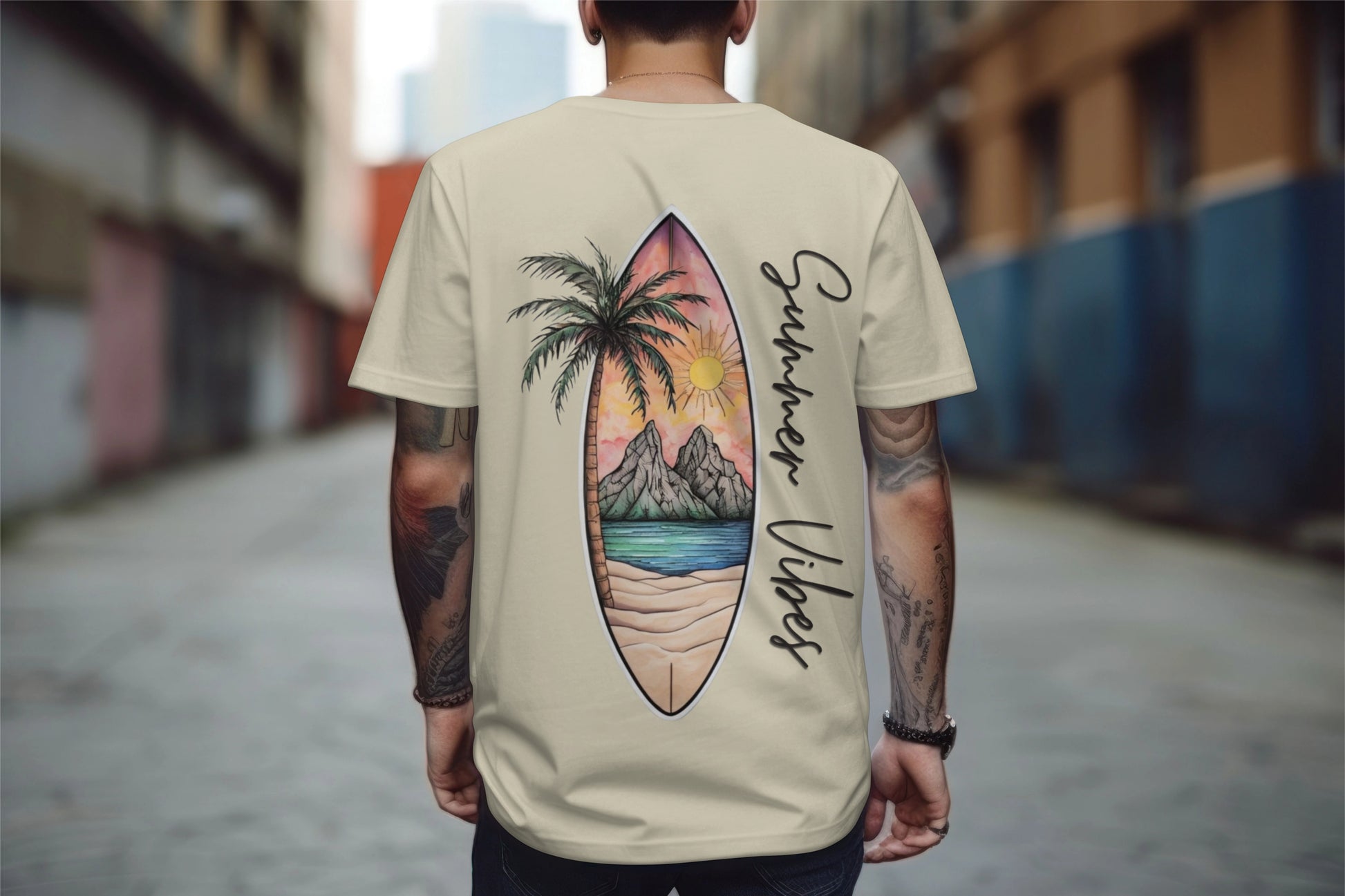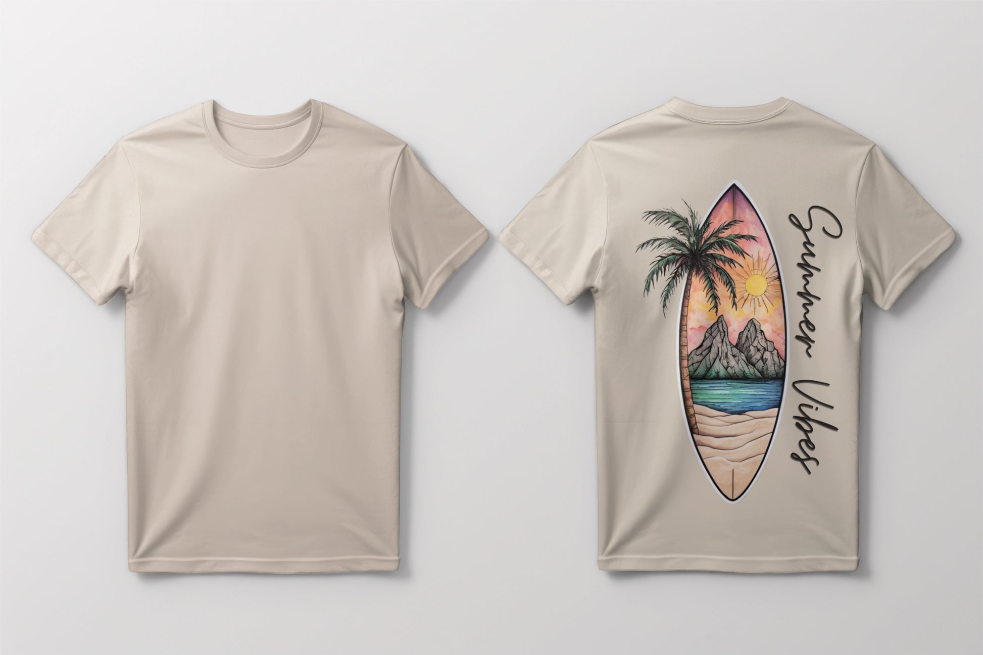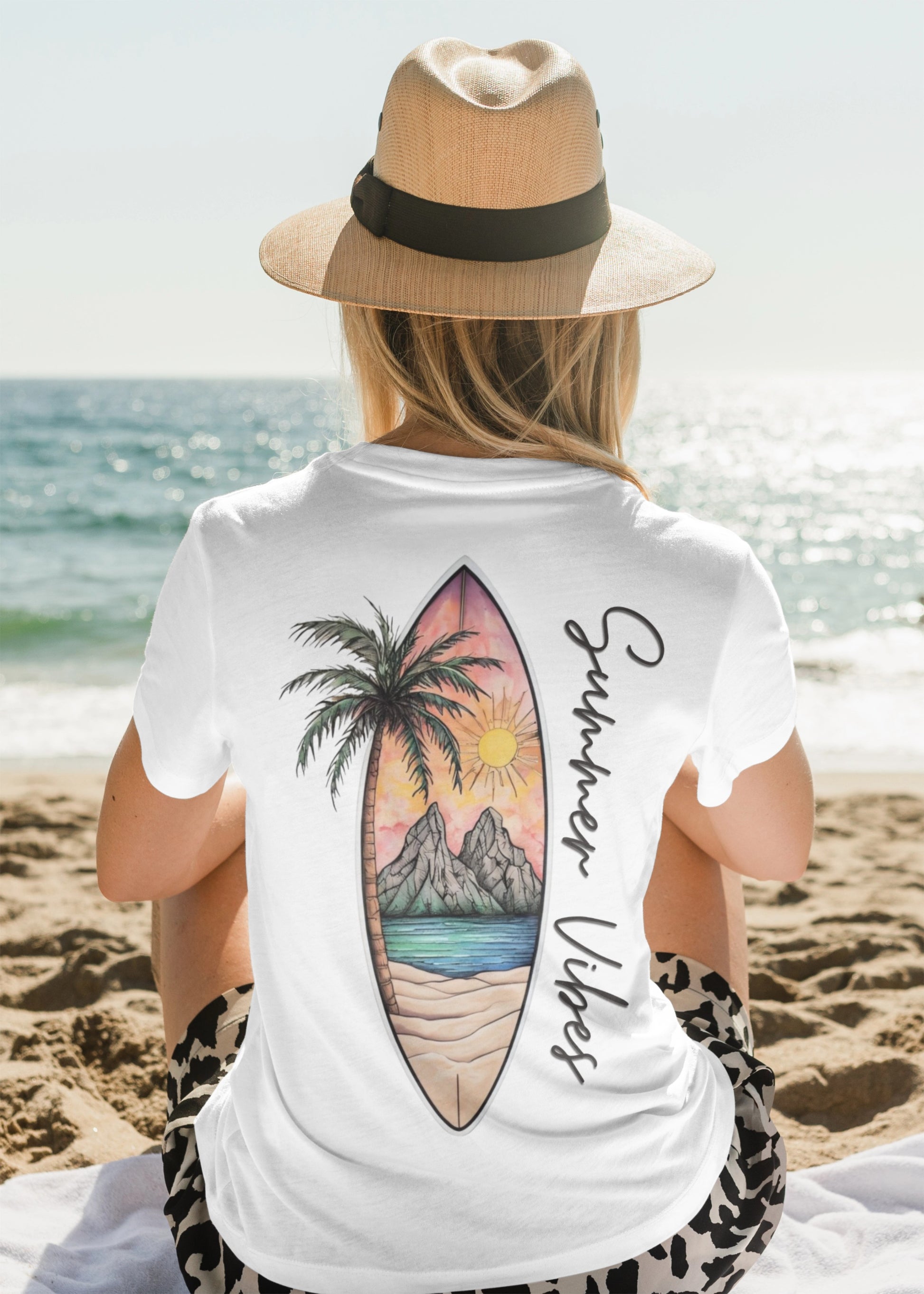 Capture the spirit of endless summer with our Summer Vibes T-shirt by Kimbarli. Featuring a hand-drawn tropical surfboard design with a golden sunset, palm trees, tranquil beach, and mountain backdrop, this tee is made for beach lovers, adventurers, and free spirits.