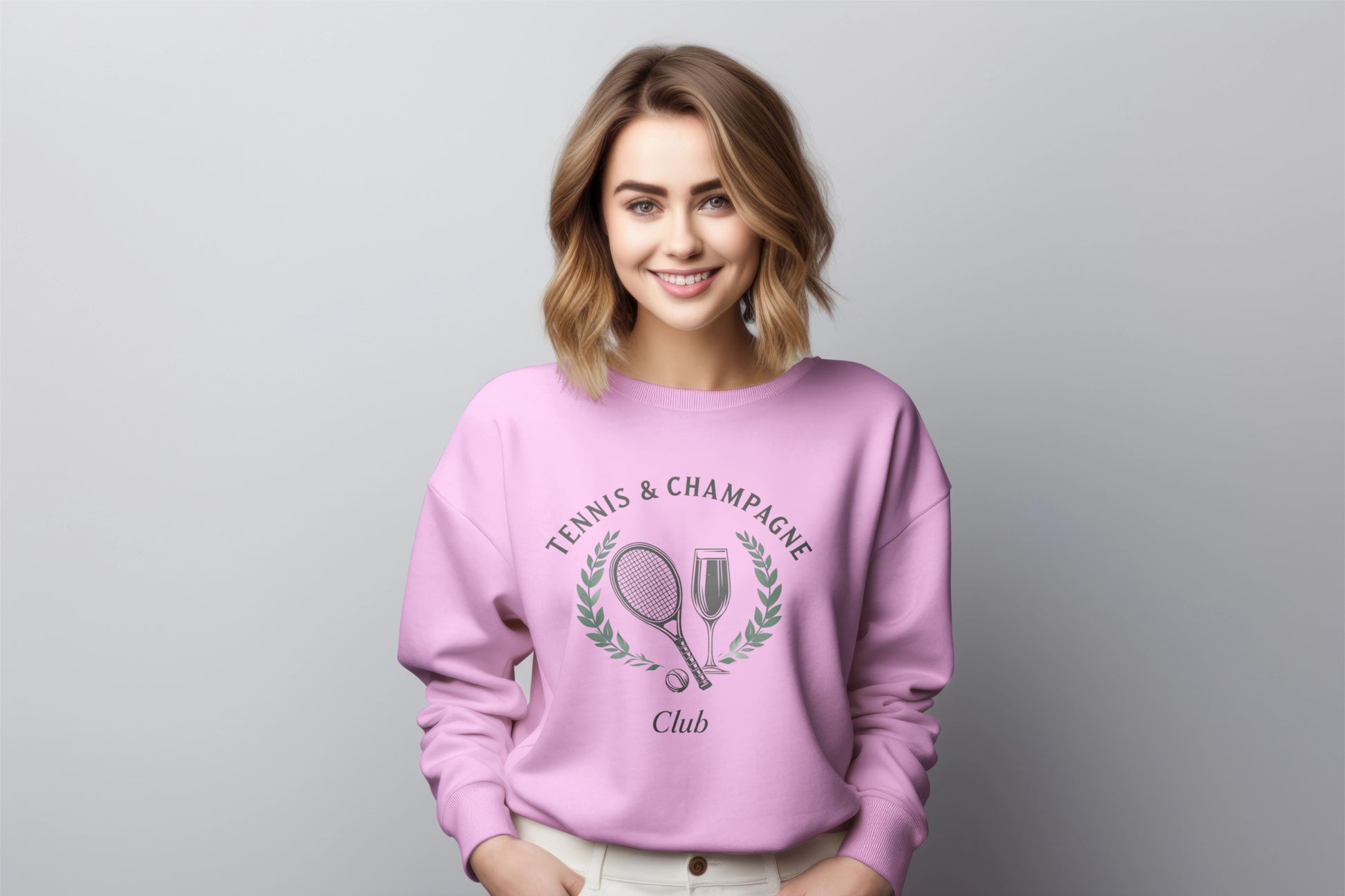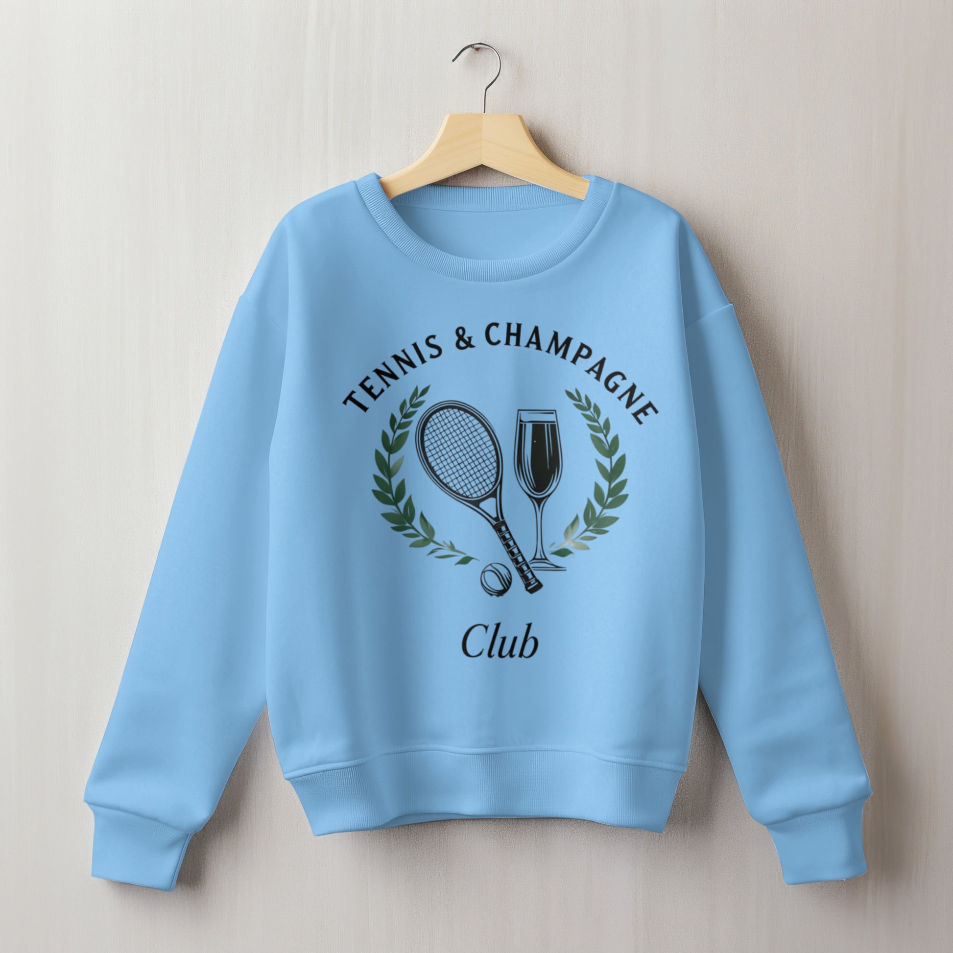Kimbarli™ Tennis & Champagne Club Sweatshirt in light blue, designed for women with a preppy Tenniscore aesthetic. This luxe sporty crewneck gives off a classy vibe, perfect for tennis enthusiasts and champagne lovers. Ideal for casual outings, tennis matches, country club events, and brunch dates.